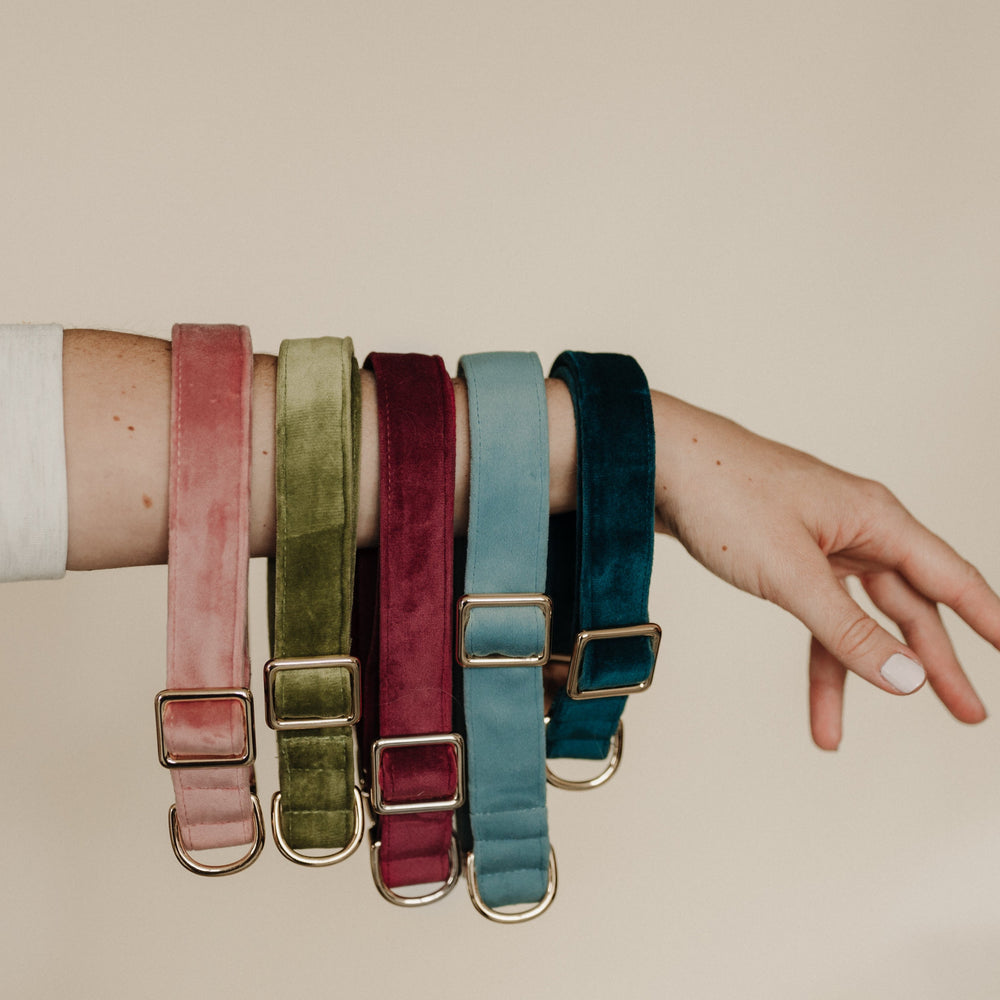 Millenial blush pink velvet dog collars with gold hardware in sizes medium and small
